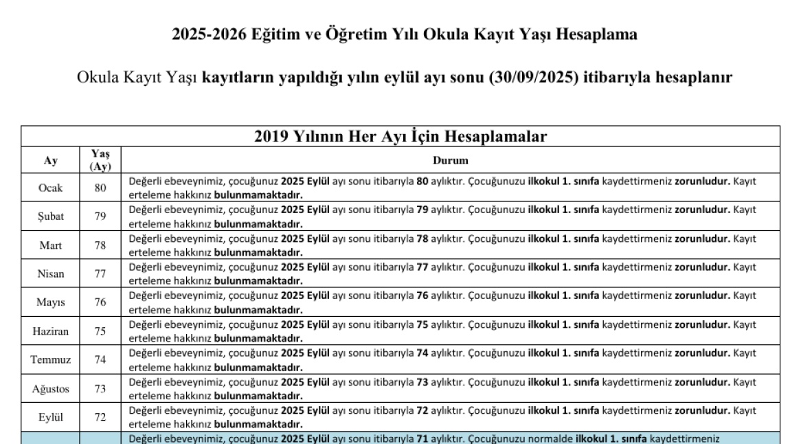 2025 - 2026 EĞİTİM ÖĞRETİM YILI OKUL KAYIT YAŞLARI