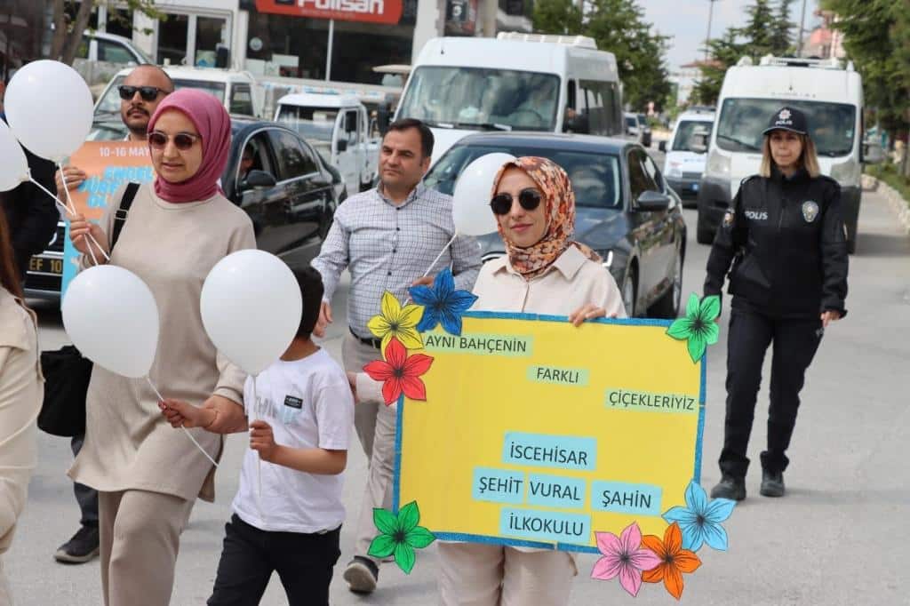 Hükümet Konağı önünden başlayan yürüyüşte, özel öğrencilerimiz ellerinde pankartlarla yürürken, yol boyunca duygu dolu anlar yaşandı. Yürüyüşe destek vermek isteyen İscehisar halkı ve İscehisar Anaokulu öğrencileri, güzergah boyunca alkışlarla arkadaşlarına moral verdi. Sonrasında öğrenciler servislerle Karamehmet Aliyeana Okulu konferans salonunda etkinlikler yaptılar.