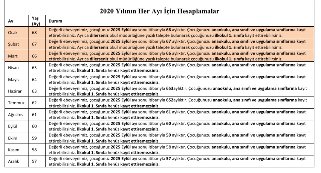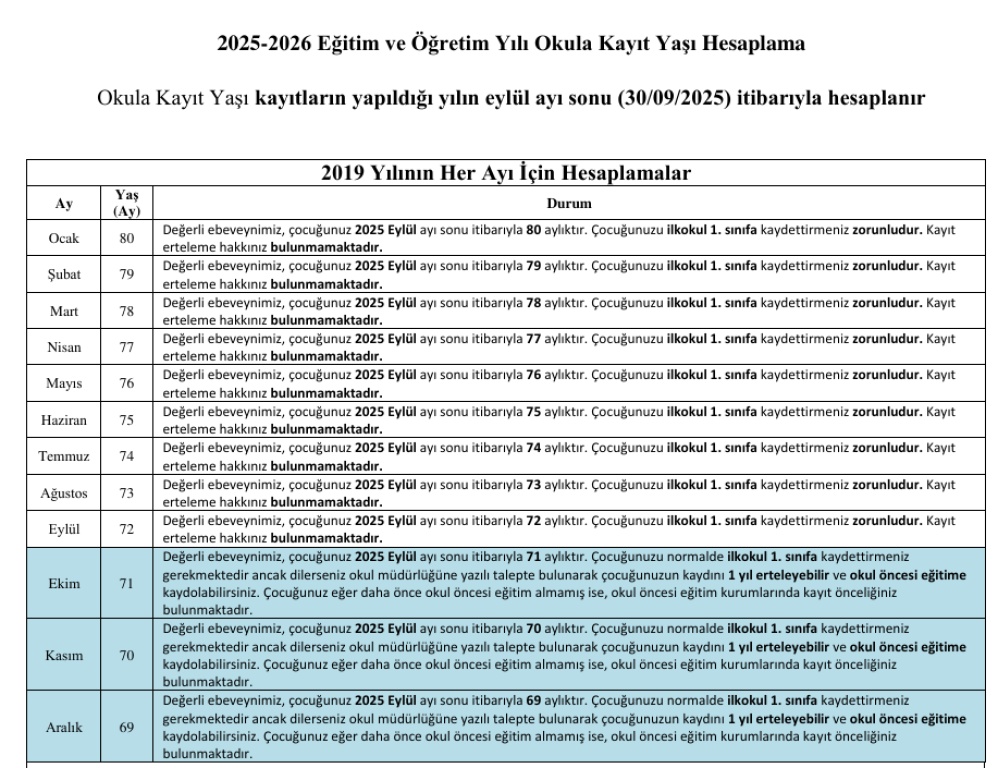 2025 - 2026 EĞİTİM ÖĞRETİM YILI OKUL KAYIT YAŞLARI